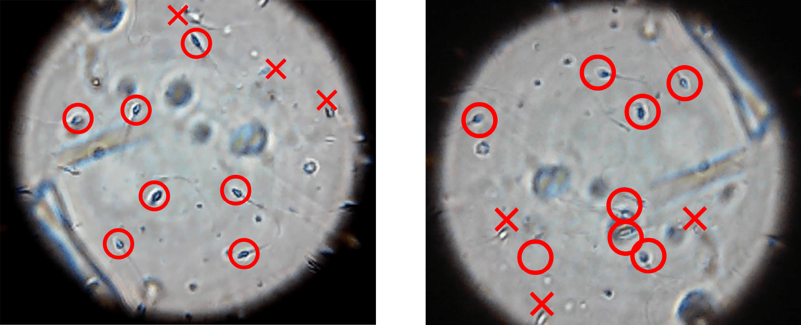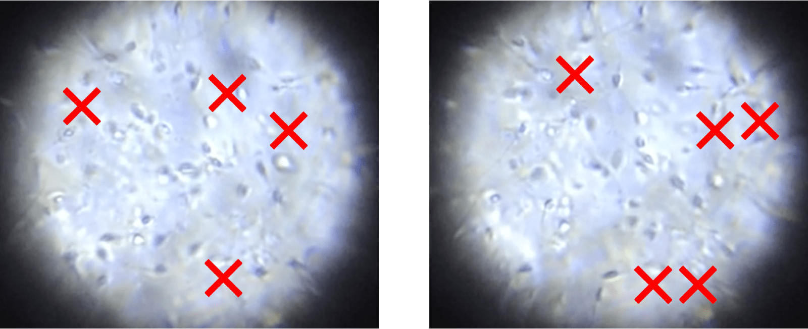 - 1秒間の動画を観察しながら、頭部にフォーカスのあっている精子の数をカウントします。